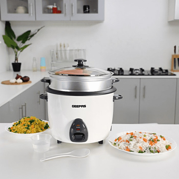 دارای یک پیمانه برای انداز گیری برنج و مقدار به اندازه آب می باشد دارای یک کفگیر از جنس پلاستیک نسوز می باشد