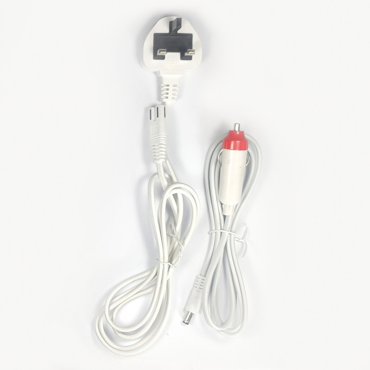 دارای 1 عدد کابل با سه شاخه برای اتصال دستگاه به برق شهری و 1 عدد کابل فندکی خودرو کارکرد با آداپتور 12Vو فندکی اتومبیل و همچنین برق شهری ایران محدوده دما:17 درجه پایین تر از دمای محیط