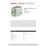برند آریته زیر گروه شرکت دلونگی ایتالیا است و از این رو محصولات این برند از کیفیت بسیار بالایی برخوردار می باشند. توستر نان آریته مدل 155vintage از سری Vintage شرکت آریته می باشد. سری Vintageشرکت آریته را می توان یکی از شاهکارهای طراحی صنعتی در حیطه لوازم خانگی دانست. این مجموعه دارای طراحی کلاسیک بوده و در کنار ظاهر بسیار زیبا، از لحاظ فنی بسیار پرقدرت و با کیفیت می باشد. سری Vintage شامل:کتری برقی،دستگاه اسپرسو، قهوه ساز، ،آون توستر،آب مرکبات گیری، همزن و فوم میکر می باشد. توستر نان آریته مدل 155Vintage دستگاهی بسیار بادوام و زیبا می باشد.
