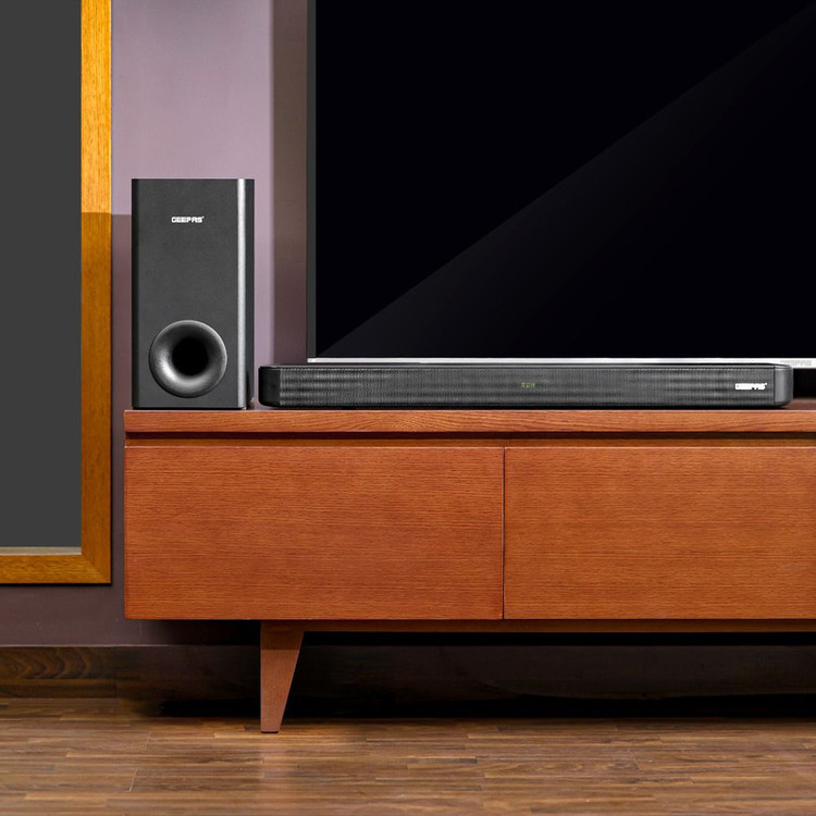 Soundbar size: 850X89X67mm و یک ساب ووفر بی سیم با ابعاد Subwoofer size: 300x180x360mm