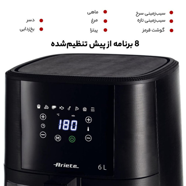 بااین سرخ کن می توانید هر ظرفی را به مقدار زیاد و فقط با یک قاشق روغن سرخ کنید تا در عین حال سرخ کردنی سالم و خوشمزه داشته باشید. به لطف سبد بزرگ 6 لیتری قابل جابجایی، با سرخ کن می توانید تا 2.5 کیلوگرم سیب زمینی سرخ کرده را همزمان بپزید! سیب زمینی سرخ کرده، اما نه تنها، همچنین کروکت، ماهی، گوشت و بسیاری از غذاهای نان دار دیگر، هم منجمد و آماده سرخ کردن، و هم تازه و نان تازه، به لطف 8 برنامه از پیش تنظیم شده.